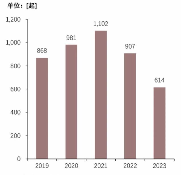 在政策引導下,專精特新領域吸引大量投資,投融資活躍度較高。截至2023年,4233家專精特新小巨人企業獲得戰略融資,309家企業獲得A輪融資。但仍有8536家企業未獲得融資,融資滲透率僅50%。從融資時間分布來看,2019—2021年融資事件逐漸增多,2021年達到1102次,之后熱度有所下降,2023年發生融資614次。未來提升融資滲透率,實現知識產權投融資全覆蓋是發展重點。