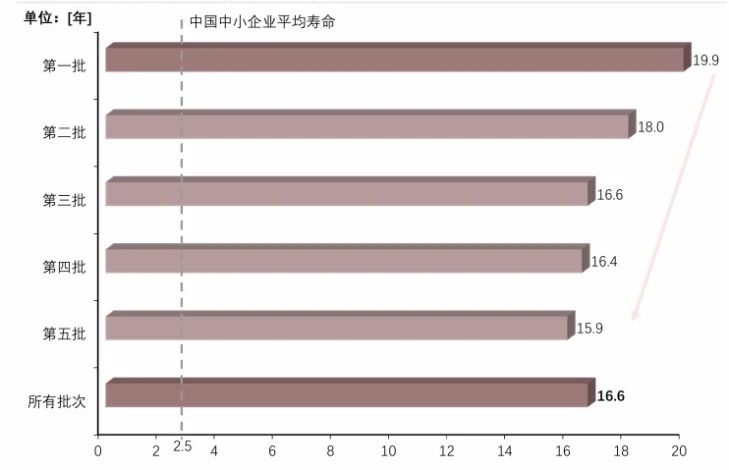 專精特新小巨人企業平均成立年限為16.6年,遠超中國中小企業平均壽命2.5年,這表明企業需經過長時間專業能力積累和沉淀,憑借過硬的技術、產品及抗風險能力,才能進入穩定發展階段。從各批次來看,2019—2023年五批次企業平均壽命呈遞減趨勢,反映出經濟發展、企業擴張和政策支持使專精特新小巨人企業成長周期縮短,未來有望實現更快成長。