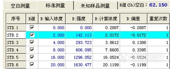標(biāo)準(zhǔn)曲線繪制,取1000μg/mL銻標(biāo)液稀釋成1000ng/mL的標(biāo)準(zhǔn)工作液,分別吸取0mL,0.2mL,0.4mL,0.8mL,1.6mL和2.0mL銻標(biāo)準(zhǔn)工作液,置于100mL容量瓶中,加入5mL鹽酸加入10mL硫脲溶液(100g/L),室溫放置30min,混勻,用去離子水定容,配置成0ng/mL,2ng/mL,4ng/mL,8ng/mL,16ng/mL和20ng/mL的標(biāo)準(zhǔn)系列溶液。繪制熒光強(qiáng)度-濃度標(biāo)準(zhǔn)曲線。