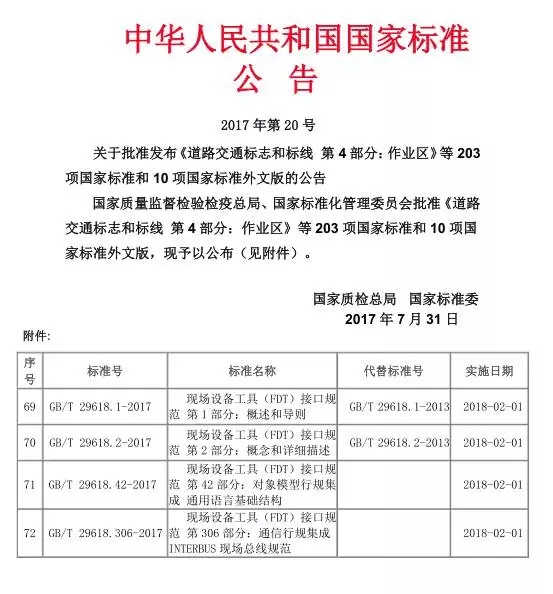 為配合中國制造2025”的實施,針對當前智能制造在集成和互聯互通標準化方面存在的問題,全國工業過程測量控制和自動化標準化技術委員會(SAC/TC124)秘書處根據國家標準制修訂程序有關規定,將《現場設備設備工具(FDT)接口規范,第1部分:概述和導則,第2部分:概念和詳細描述,第42部分:對象模型行規集成 通用語言基礎結構,第61部分:通用對象模型的設備類型管理器樣式指南,第306部分:通信行規集成 INTERBUS現場總線規范,第515部分:通用對象模型的通信實現 MODBUS現場總線規范》列為SAC/TC124標委會2015年度推薦性國家標準制定計劃項目,并已完成所有計劃工作內容,經國家標準化管理委員會批準,已于2017731日發布。