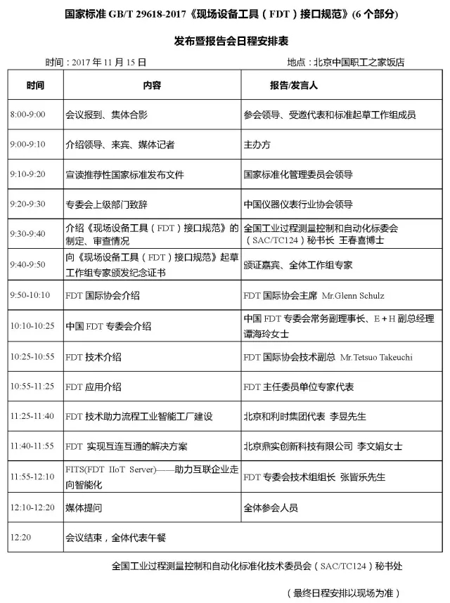 20171115日,國家標準GB/T 29618-2017現場設備工具(FDT)接口規范 (6個部分)發布暨報告會將在北京舉行。本次發布會將由全國工業過程測量控制和自動化標準化技術委員會(SAC/TC124)主辦,機械工業儀器儀表綜合技術經濟研究所(ITEI)承辦,中國儀器儀表行業協會,FDT專業委員會和西南大學協辦。