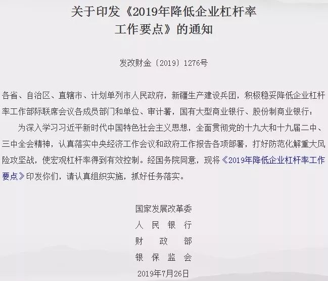 國家發改委7月29日消息,國家發改委、中國人民銀行、財政部、銀保監會近日聯合印發《2019年降低企業杠桿率工作要點》,明確了2019年降低企業杠桿率的21項任務清單和時間表。