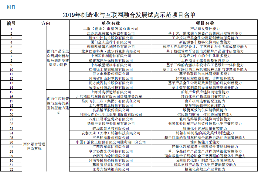 11月5日,工信部公示2019年制造業與互聯網融合發展試點示范項目名單。經企業自主申報、地方推薦和專家評審,工業和信息化部擬將產品研發管控能力等137個項目核定為2019年制造業與互聯網融合發展試點示范項目(簡稱“試點示范項目”)。