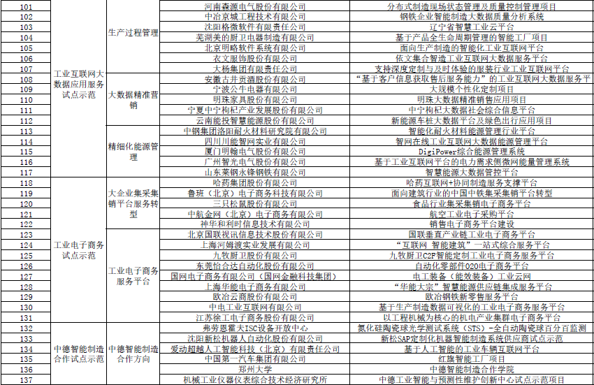 其他試點示范項目有:重點行業工業互聯網平臺試點示范項目38個,分為23個離散行業重點工業互聯網平臺項目,及15個流程行業重點工業互聯網平臺項目。信息物理系統(CPS)試點示范方向共10個項目,包括信息物理系統共性技術研發及信息物理系統行業應用兩個方向。工業互聯網大數據應用服務試點示范共18個項目,包括生產過程管理、大數據精準營銷、精細化能源管理三個方向。工業電子商務試點示范14個項目,包括大企業集采集銷平臺服務轉型及工業電子商務服務平臺兩個方向。中德智能制造合作試點示范6個。