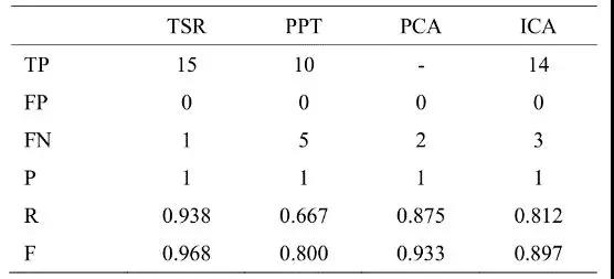 注:TP表示被檢測出且實際存在的缺陷;FP表示被檢測出卻不是實際存在的缺陷;FN表示實際存在卻沒有被檢測出的缺陷;TN表示不存在也沒有檢測出來的缺陷;P表示缺陷檢測準(zhǔn)確率;R為召回率;F表示P和R的加權(quán)調(diào)和平均。