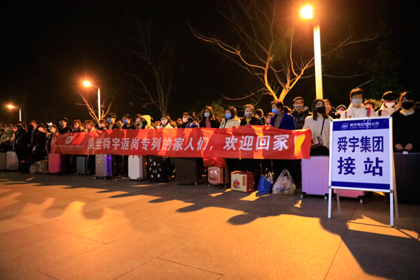 “乘坐舜宇返崗專列的家人們,歡迎回家。”2020年2月18日晚,高鐵余姚北站和寧波站接站口,迎接舜宇員工的橫幅格外鮮亮。三輛搭載著舜宇職工的“員工專列”先后抵達,近300名來自周口、阜陽、成都、貴州、南昌、上饒等地區的舜宇員工及其親屬友人在政府及公司工作人員的引導下,井然有序地出站。