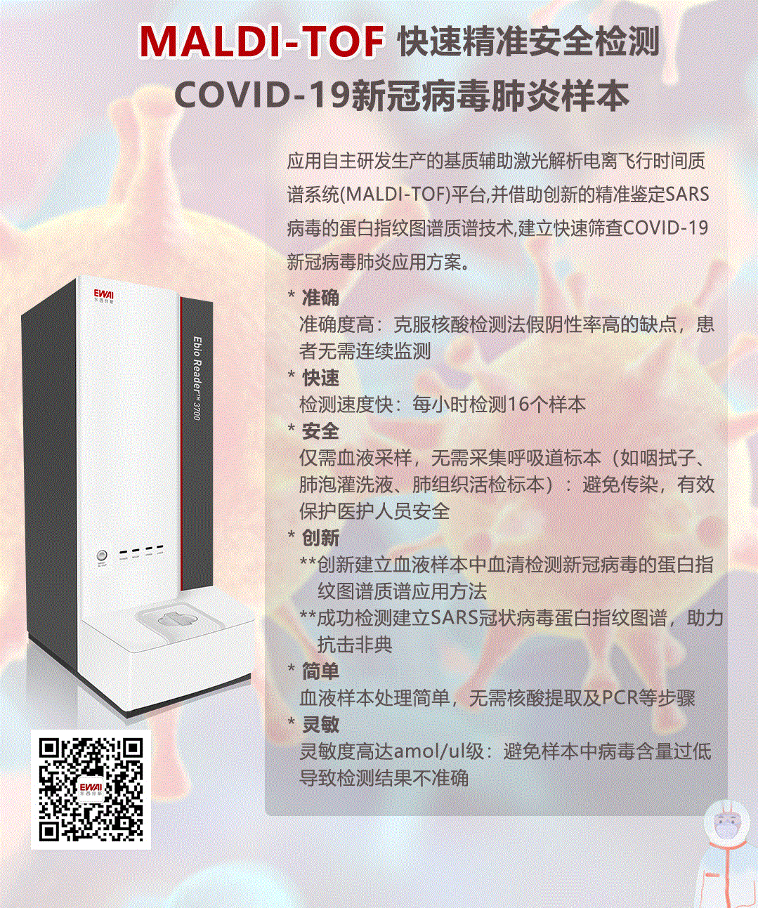 公司應(yīng)用MALDI-TOF平臺(tái),借助創(chuàng)新的精準(zhǔn)鑒定SARS病毒蛋白指紋圖譜質(zhì)譜技術(shù),建立了快速篩查COVID-19新冠病毒應(yīng)用方案。檢測(cè)時(shí)無(wú)需核酸提取及PCR步驟,具有準(zhǔn)確、快速、安全、簡(jiǎn)便和高靈敏的特點(diǎn),能夠精準(zhǔn)區(qū)別冠狀病毒肺炎患者和普通肺炎及流感患者。
