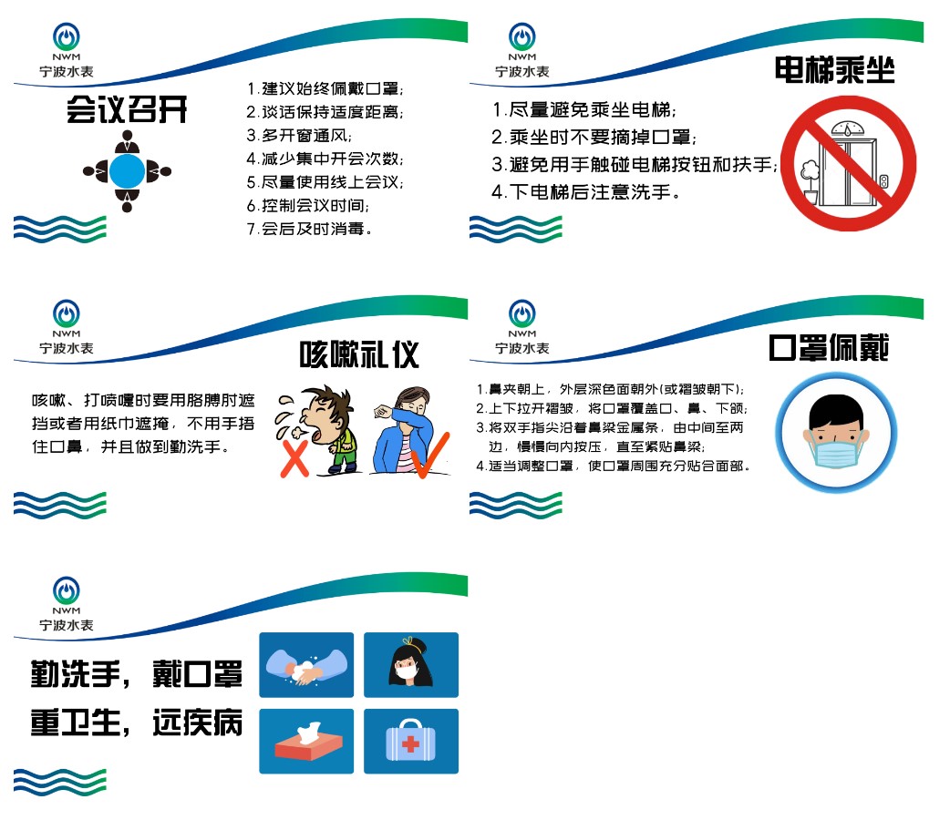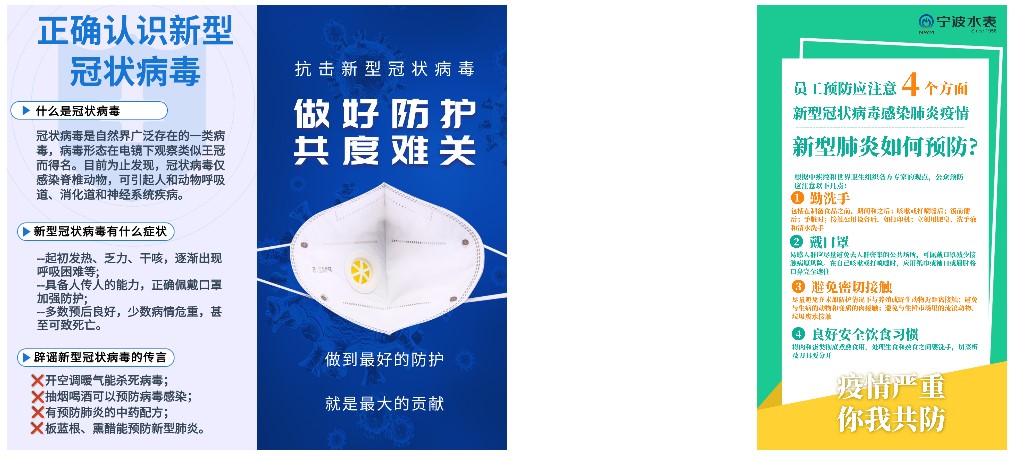2020年2月8日,寧波水表在公司“創(chuàng)意魚群”等微信公眾號(hào)上發(fā)布《寧波水表—安全生產(chǎn)思維阻擊疫情》等宣傳資料,并號(hào)召全員積極轉(zhuǎn)發(fā)朋友圈、各類微信群,通過對(duì)疫情期間防護(hù)工具、防疫要素等相關(guān)知識(shí)的教育宣傳,進(jìn)一步提高全司員工及公眾對(duì)疫情的自我防護(hù)意識(shí)。