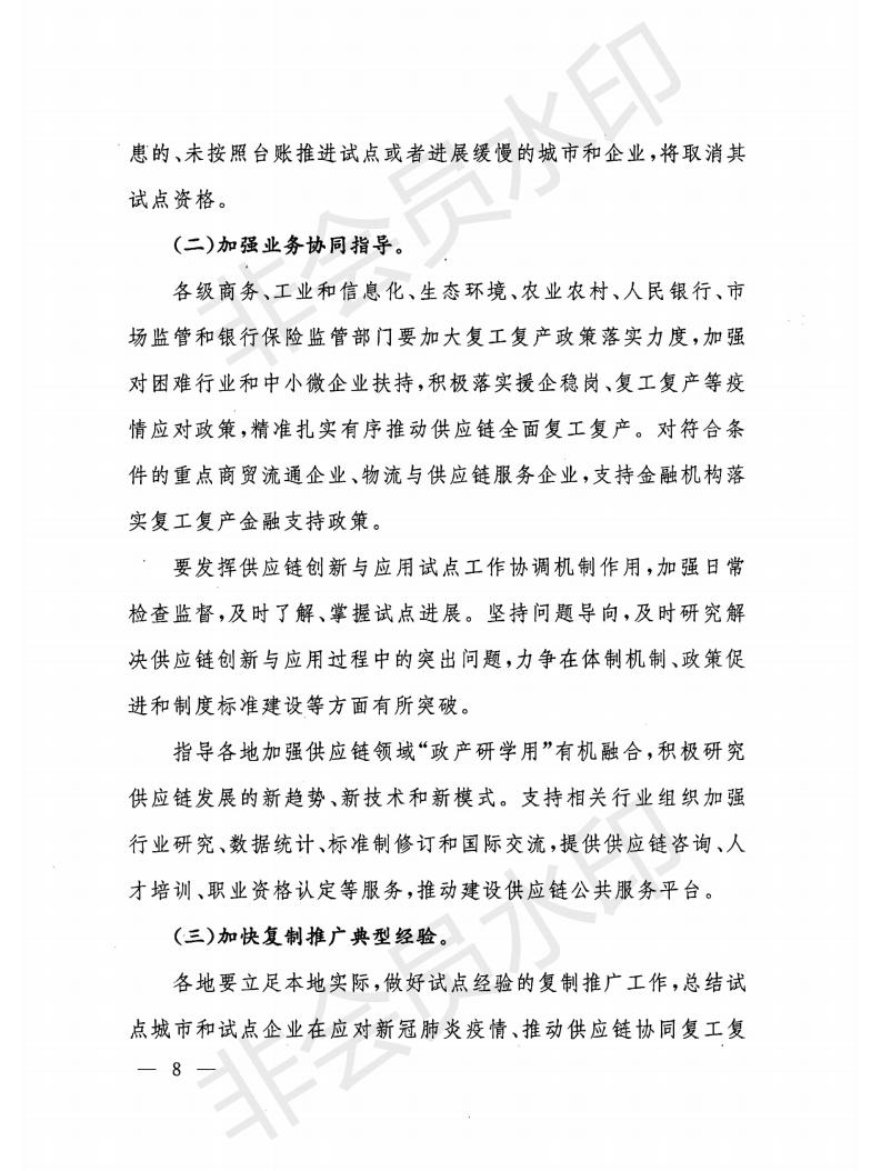 通知強調,試點城市和試點企業要扎實推進試點工作,結合試點中期評估反饋意見和今年重點工作方向,制定針對性的整改落實措施,進一步完善工作思路和具體實施方案,加快試點工作進度,確保試點工作各項任務目標按期高質量完成;各部門要加強業務協同指導,精準扎實有序推動供應鏈全面復工復產,加強日常檢查監督,指導各地加強供應鏈領域“政產研學用”有機融合;各地要立足本地實際,加快復制推廣典型經驗。