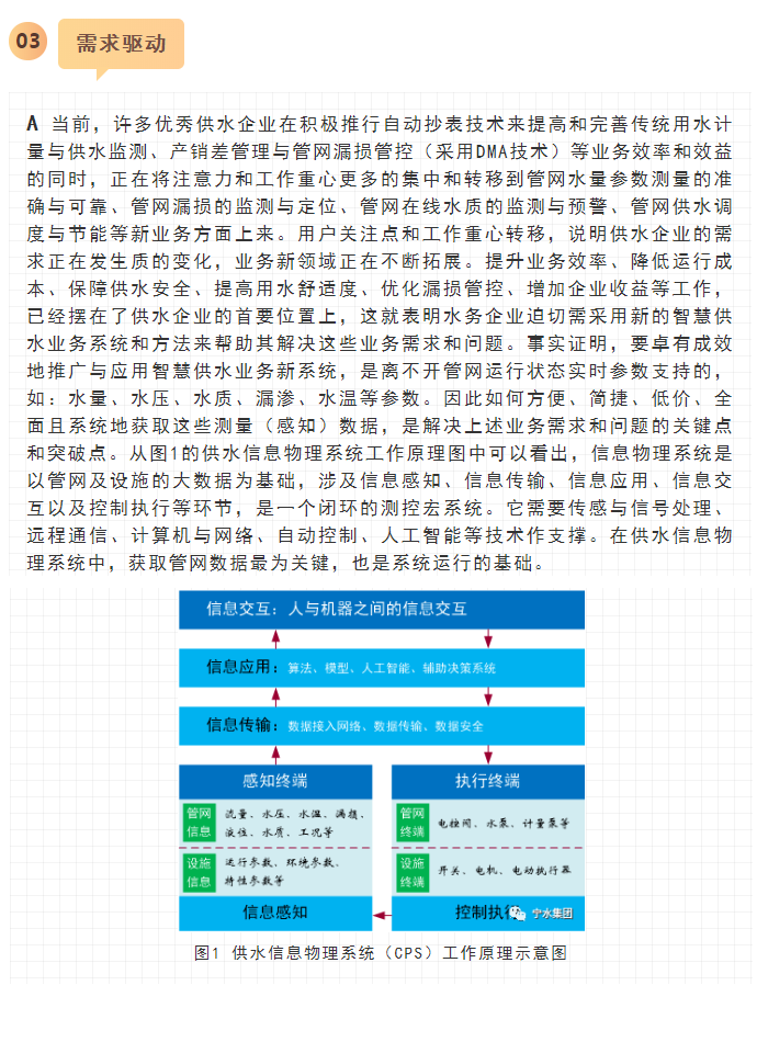 寧水集團2019年初在主板A股上市后,進一步確立了服務(wù)于智慧供水新業(yè)務(wù)的戰(zhàn)略方針與目標,在持續(xù)做好水表產(chǎn)品水計量性能提升、以NB-IoT及5G技術(shù)等為代表的無線數(shù)據(jù)遠傳業(yè)務(wù)拓展以及DMA分區(qū)計量漏損監(jiān)測、水務(wù)信息化應(yīng)用等工作基礎(chǔ)上,正在努力向供水管網(wǎng)數(shù)據(jù)綜合提供商和智慧供水核心業(yè)務(wù)服務(wù)商轉(zhuǎn)型與升級,其近中期目標是向供水企業(yè)提供在線一體化的高性價比管網(wǎng)綜合大數(shù)據(jù)感知裝置(包括:水量、水壓、水質(zhì)、漏滲、水溫等參數(shù)),為智慧供水新業(yè)務(wù)及水務(wù)信息化云平臺提供海量數(shù)據(jù)支撐,使現(xiàn)有水力、水質(zhì)、漏損、能耗等水務(wù)管網(wǎng)模型運行準確度能夠顯著提升。