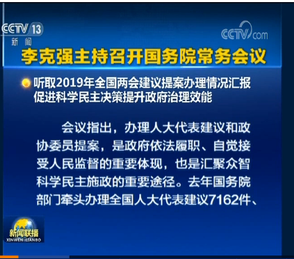 國務院總理李克強428日主持召開國務院常務會議,聽取2019年全國兩會建議提案辦理情況匯報,促進科學民主決策、提升政府治理效能;部署加快推進信息網絡等新型基礎設施建設,推動產業和消費升級。