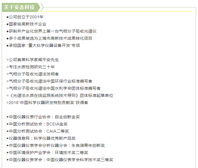 上海安杰環保科技股份有限公司是中國儀器儀表行業協會會員單位,成功研發出儀AJ-3700系列氣相分子吸收光譜儀。該儀器適用于地表水、地下水、海水、飲用水、生活污水及工業污水中氮化物、硫化物的測定。能夠快速準確地分析水體中亞硝酸鹽氮、氨氮、硝酸鹽氮、凱氏氮、總氮、硫化物等環境檢測指標,結果不受水體本底干擾,無汞污染隱患。為各級環監部門靠前指揮,正確決策,防止重大事故發生,提供準確數據,是各水質分析人員的得力助手和環境保護的忠誠衛士。