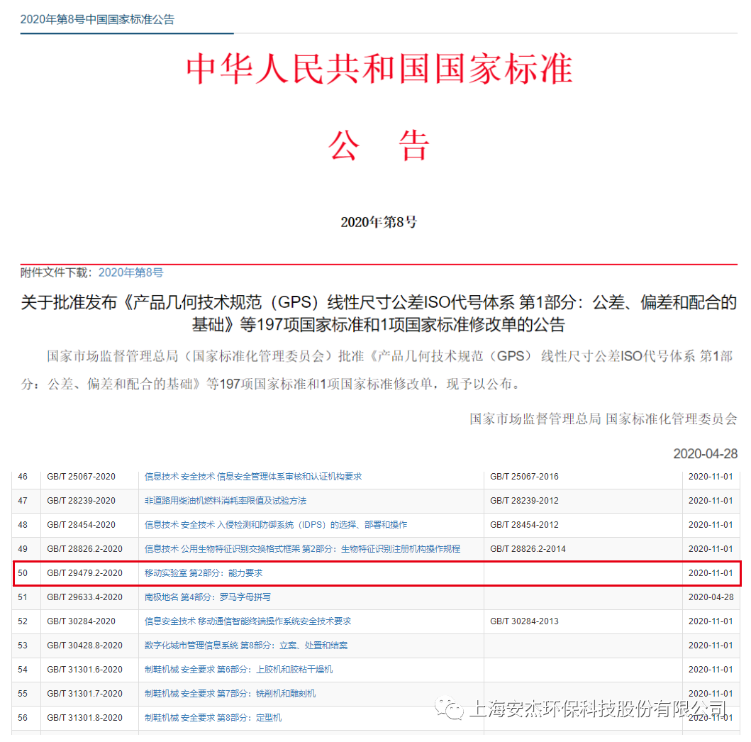 2020年0428日,國家市場監(jiān)督管理總局國家標準化管理委員會發(fā)布了2020年第8號中國國家標準公告,《GB/T29479.2-2020 移動實驗室 第二部分:能力要求》獲得批準發(fā)布。