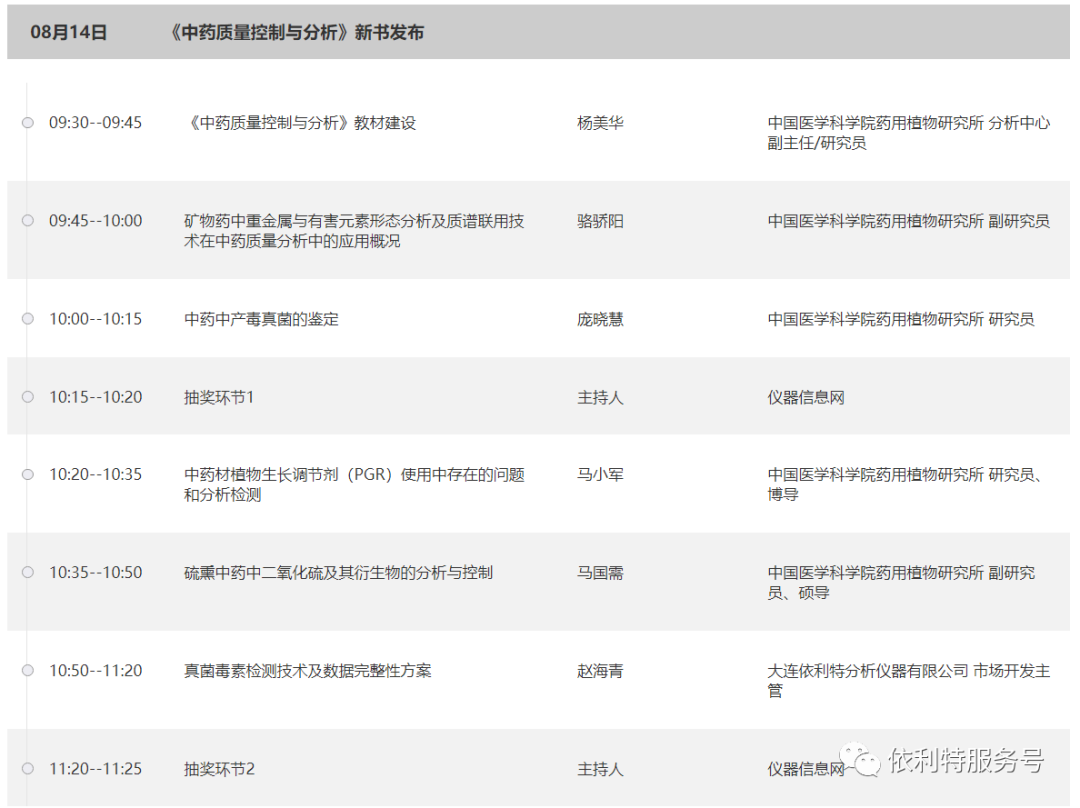 2、關注【依利特服務號】,獲得會后回放視頻、并有機會獲得《中藥質量控制與分析》新書。
