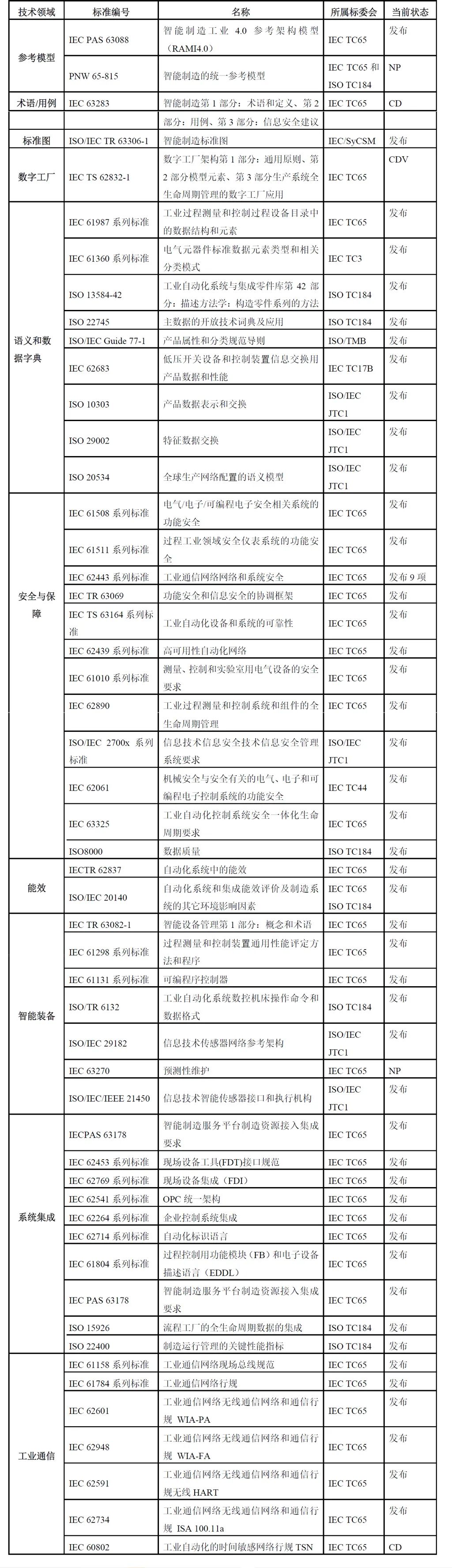 IEC/TC65從2012年開始數字工廠國際標準的研制工作,是開展智能制造國際標準化的核心技術組織。下設TC65/WG23“智能制造框架和概念”、與ISO/TC184聯合成立JWG21“智能制造參考模型”、SC65E/AHG1“智能制造信息模型”等智能制造專題工作組,以及TC65/WG16“數字工廠”、TC65/WG24“工業應用資產管理殼”、SC65E/WG12“預測性維護”等智能制造支撐技術工作組。下設4個分委員會:SC65A(系統方面)、SC65B(測量和控制設備)、SC65C(工業網絡)和SC65E(企業系統中的設備和集成),共有60個工作組,已制定近400項工業自動化國際標準,特別是智能制造參考架構模型、數字工廠、系統集成、測控裝置、通信網絡、能效、功能安全、工業信息安全等國際標準已成為國際公認的智能制造核心支撐標準。