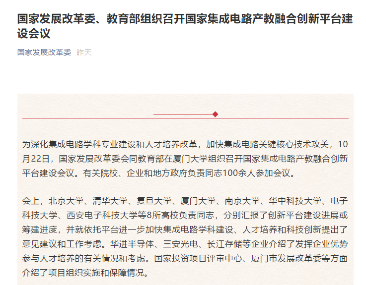 據國家發展改革委10月26日消息,為深化集成電路學科專業建設和人才培養改革,加快集成電路關鍵核心技術攻關,10月22日,國家發展改革委會同教育部在廈門大學組織召開國家集成電路產教融合創新平臺建設會議。