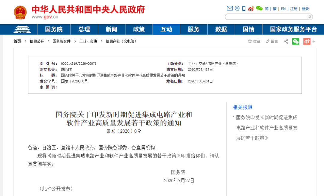 8月4日,國務院發布關于印發《新時期促進集成電路產業和軟件產業高質量發展的若干政策》的通知。