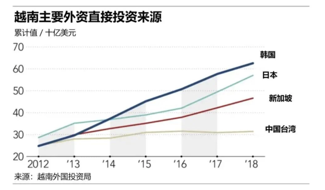 近十年,三星在越南總計投資超過173億美元。僅智能手機一項,越南工廠每年產量就在1.5億臺左右,約占全球總產量的一半。而從整體上看,2018年越南三星的出口額達到600億美元,是越南全國出口的1/3。更為重要的是,韓國在親力親為的培育配套產業鏈的生長。