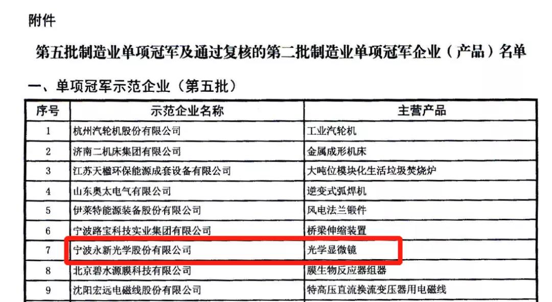 寧波永新光學股份有限公司于2017年參與國家第二批制造業(yè)單項冠軍企業(yè)評選,并憑借產品——光學顯微鏡,成功入選第二批國家制造業(yè)單項冠軍培育企業(yè)。按照國家工信部要求,本次成功通過復評升級為國家級制造業(yè)“單項冠軍示范企業(yè)”,這既是國家與市場對永新光學產品的肯定,也是永新光學自身實力強有力的證明,有助于更好激發(fā)公司不斷開拓創(chuàng)新,積極研發(fā)新產品。