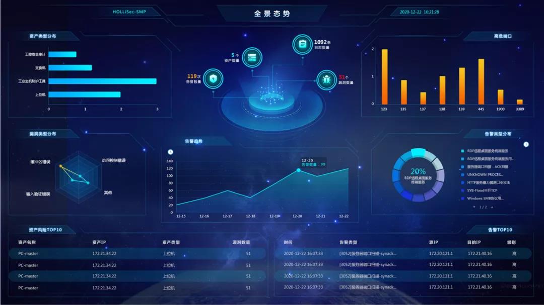 和利時工業安全態勢感知系統,可實現工業安全設備和工業資產集中管控,基于審計、日志、態勢、告警和事件等多維度輸入,提供攻擊溯源能力,支持多種異構數據和協議的全方位數據采集和分析。同時,該系統以全景態勢可視化呈現,多維度展示安全態勢感知,支持安全、業務、告警、時間的多維度關聯安全分析。