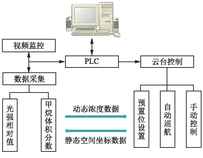 系統監控終端軟件平臺基于力控組態軟件與可編程邏輯控制器進行開發,其上位機監控軟件采用力控ForceControl7.2組態軟件進行搭建,下位機系統軟件采用PLC編程軟件實現,通過上位機與下位機之間的通信連接可實現對激光氣體傳感器的運行控制以及對天然氣站場天然氣泄漏的實時監測。根據天然氣站場可燃氣體監測的需求,系統中設有云臺控制、視頻監控、數據采集三大模塊。