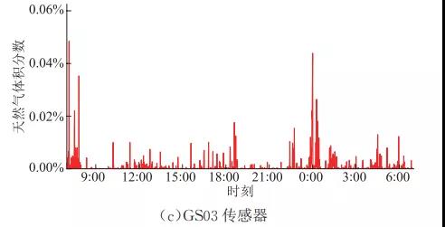 對傳感器運行參數設置完成后,選取系統運行一日的監測數據,分析可知:過濾區與空冷區管道設備種類繁多,包括大量閥門、法蘭等部件,且負責大輸送量的天然氣過濾與冷卻等工藝,其在日常的運行中存在微量泄漏,天然氣體積分數一般處于200×10-6以下,遠低于爆炸極限,處于安全水平。此外,該工藝區在7:00與0:00均監測到較高的天然氣泄漏,此現象與該時間段輸氣壓力較高有關。而增壓區的設備主要是輸氣管道,工藝較為簡單,因此存在的微泄漏現象相比過濾區與冷卻區輕微,天然氣體積分數多集中在100×10-6下。以上監測結果符合壓氣站實際情況,說明該系統具有較好的準確性與實用性。