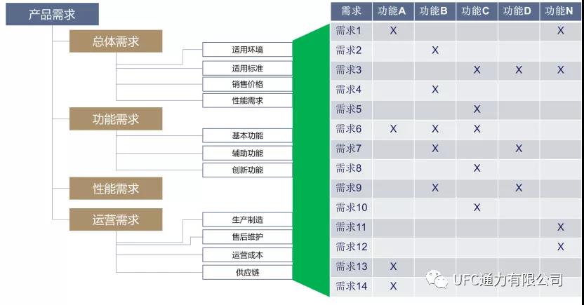 完成產品規劃以后,就需要考慮如何搭建滿足市場需求的產品平臺。通常的做法是基于歷史訂單的分析和產品規劃結果,進行產品功能與需求之間的匹配,從而實現產品功能的解構,并最終形成產品功能架構(見圖3所示),并以層次推演的方式進行表達。