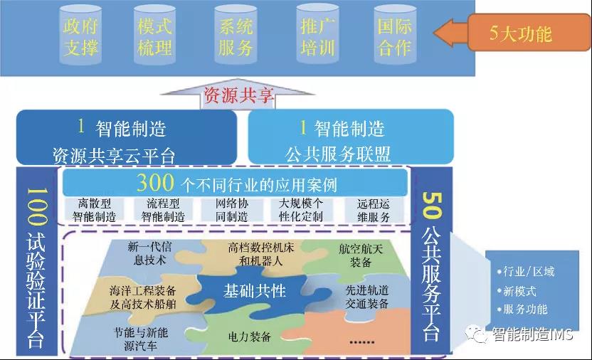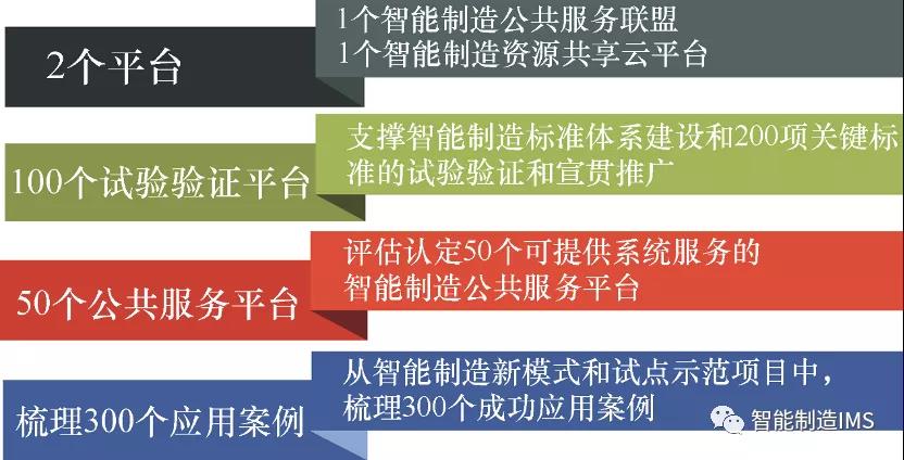 2”是打造兩個平臺———1 個智能制造公共服務聯盟和1 個智能制造資源共享云平臺; “1”100 個試驗驗證平臺———從已建成或擬建成的智能制造綜合標準化項目的標準實驗驗證平臺中, 評估認定100 個平臺, 用于支撐智能制造標準體系建設及200 項關鍵標準試驗驗證和宣貫推廣的基地; “5”50 個公共服務平臺———從智能制造綜合標準化項目標準試驗驗證平臺、地方自助或企業自建的服務平臺中, 評估認定50 個可提供系統服務的智能制造公共服務平臺; “3”300 個應用案例———從智能制造新模式和試點示范項目中, 梳理出300 個典型成功應用案例, 面向不同行業、領域推廣智能制造新模式和成功經驗, 甚至直接復制智能工廠/ 數字化車間。