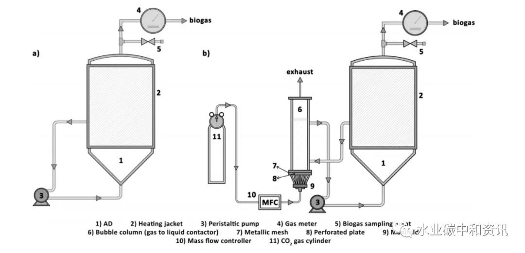 眾所周知,CO2是在消化過程中伴隨著甲烷產生的產物。而另一方面,利用厭氧消化進行CO2捕集固定是一種潛力十足的碳減排策略。兩個處理食品垃圾的厭氧消化試驗進行了225 d監測,實驗組定期使用氣泡柱充入CO2(Fernandez et al.)。實驗組測試CH4產率為0.56±0.13 m3 CH4/kgVS·d(對照組為0.45±0.05 )沼氣中CH4濃度為68%,額外攝取了外源CO2 0.55 kg,H2濃度增加了2.5 倍,這歸因于CO2溶解以及酸化與產氫途徑改變。