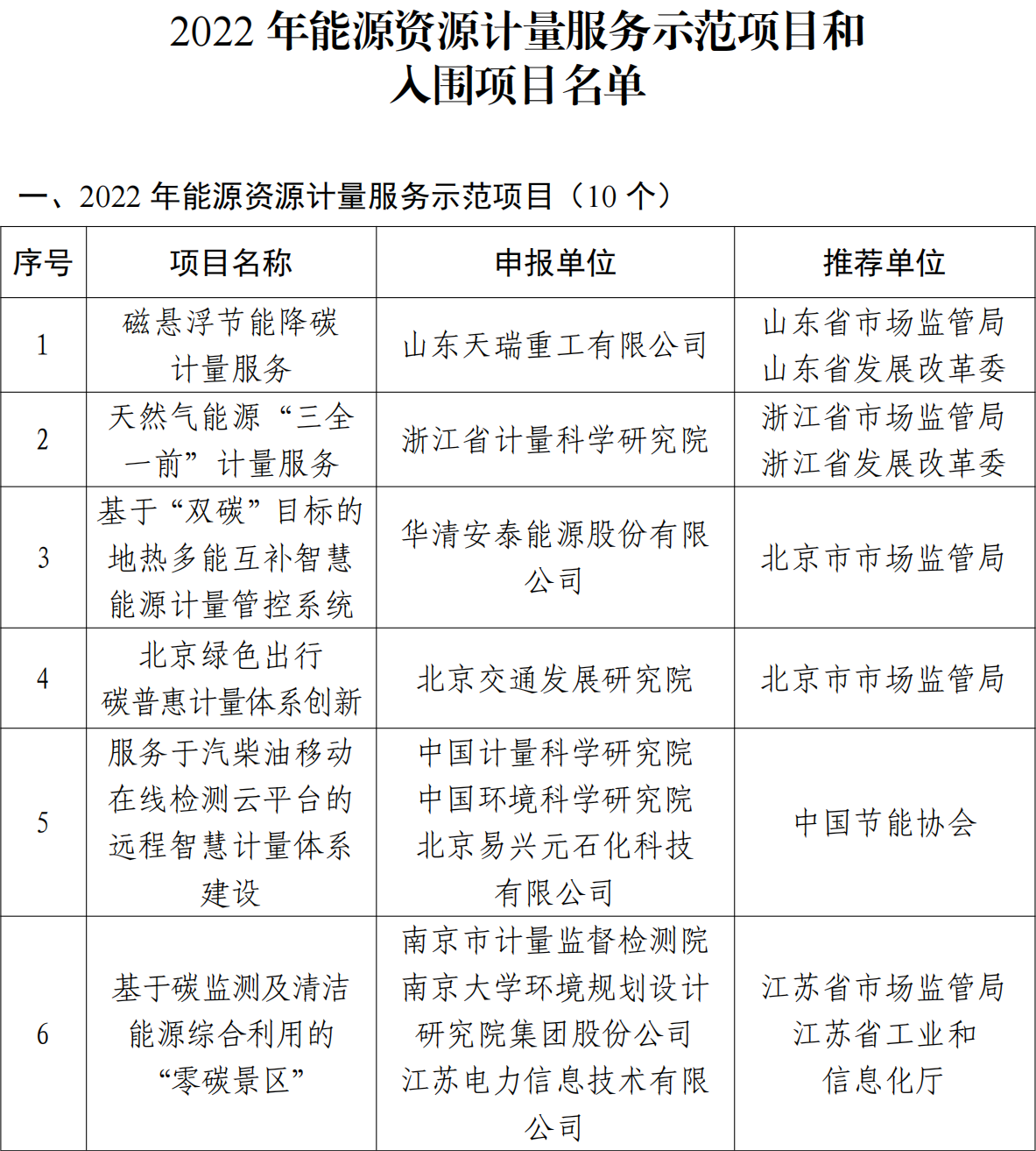 為進一步完善能源資源計量體系,促進能源資源節約和綠色發展,市場監管總局、國家發展改革委在全國范圍內聯合開展了2022年能源資源計量服務示范活動。近日,兩部門聯合印發《關于公布2022年能源資源計量服務示范項目和入圍項目名單的通知》(以下簡稱《通知》),共30個項目在列,分別是2022年度全國能源資源計量服務示范項目10個,2022年度全國能源資源計量服務示范入圍項目20個。