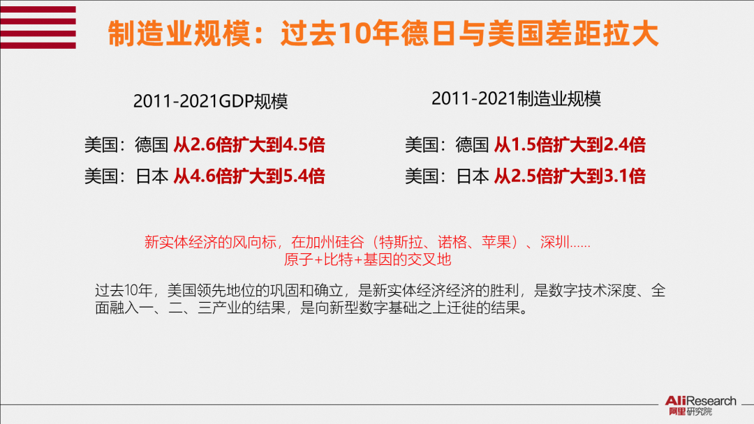 然而事實是,在過去的十年,德國、日本的GDP規模與美國的差距在拉大:從20112021年,美國GDP從相當于德國的2.6倍擴大到了4.5倍,相當于日本的4.6倍擴大到了5.4倍;更值的關注的是,就制造業而言,德國、日本的制造業規模與美國的差距仍在拉大:20112021年,美國制造業規模相當于德國的1.5倍擴大到2.4倍,相當于日本的2.5倍擴大到3.1倍。制造業領域美國正在涌現出一批具有全球競爭力的數字原生企業,美國制造業仍然以比日本和德國更快的速度發展。
