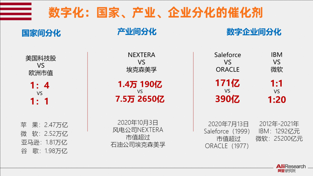 疫情前,美國所有科技公司的估值僅相當于歐洲所有國家上市公司估值的1/4。疫情后,美國科技公司的估值已經超過了歐洲所有國家上市公司總估值。今天,銷售額只有190億美元的新能源風電公司NEXTER的市值,已經超過了曾經的全球市值最大公司艾克森美孚。ICT產業內部也在急劇分化,IBM、微軟在十年前的市值都差不多 ,但今天微軟市值已經相當于IBM10-20倍。