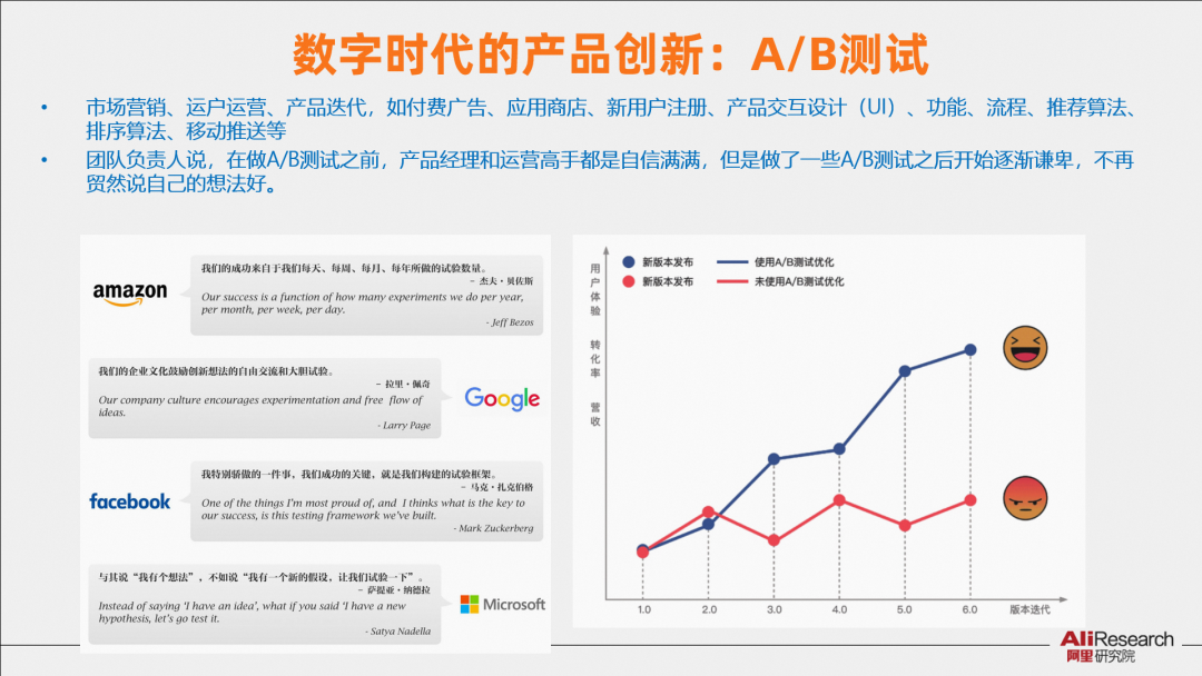 如何應對需求巨變,企業需要重構自己的研發、生產、服務體系,邁向高頻競爭時代,以供給體系的高頻創新應對需求的巨變。過去國際互聯網企業面對市場營銷、運戶運營、產品迭代,如付費廣告、應用商店、新用戶注冊、產品交互設計(UI)時,都會基于數據進行A/B測試,進行快速決策。亞馬遜貝索斯說,我們的成功來自于我們每天、每周、每月、每年的所做的實驗數量;微軟CEO說,與其說我有一想法,不如說我有一個新假設,讓我們試驗一下A/B測試是數字時代產品創新的基本模式。
