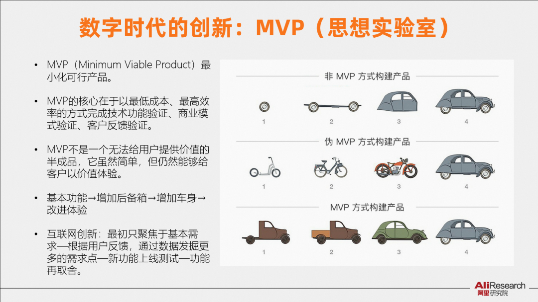 面對需求的巨變,企業構建一個思想實驗室:MVPMinimum Viable Product)最小化可行產品。MVP的核心在于以最低成本、最高效率的方式完成技術功能驗證、商業模式驗證、客戶反饋驗證。MVP不是一個無法給用戶提供價值的半成品,它雖然簡單,但仍然能夠給客戶以價值體驗。如開發一輛汽車,其路徑是,基本功能增加后備箱增加車身改進體驗。如同互聯網的創新:最初只聚焦于基本需求根據用戶反饋,通過數據發掘更多的需求點新功能上線測試功能再取舍。