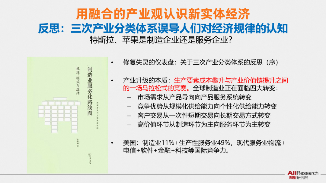 我在10年前出版的著作《制造業服務路線圖》中,就提出一個有爭議的觀點,當我們重新思考制造業和服務發展實踐時,需要反思:100年前提出的三次產業分類體系會不會誤導人們對經濟規律的認知。基于現有的經濟常識:特斯拉、蘋果是制造業公司還是服務業公司?這個其實是說不清楚的,它們已經融合了。
