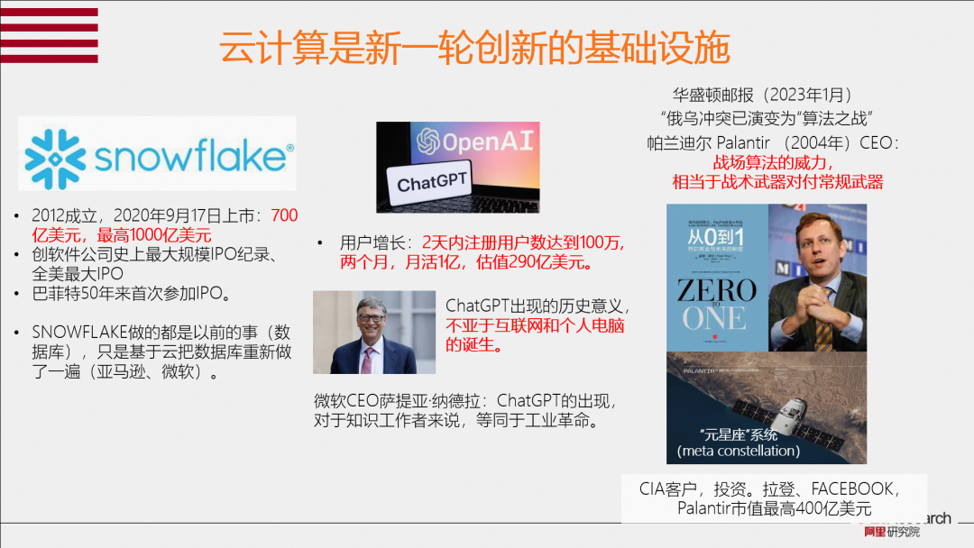 我們正在進入云計算時代,云計算不僅是一個商業基礎設施,也是一個創新基礎設施,云計算是數字技術、新企業孕育孵化的搖籃。中國云上創新與美國差距仍在擴大。當下,大家都在討論Chat GPT,有人問中國為什么沒有Chat GPT?這個問題問錯了,正確的問題是,中國為什么沒有OPEN AI?中國為什么沒有SNOWFLAKE?中國為什么沒有Palantir?還有其他一些富有創新的初創公司。