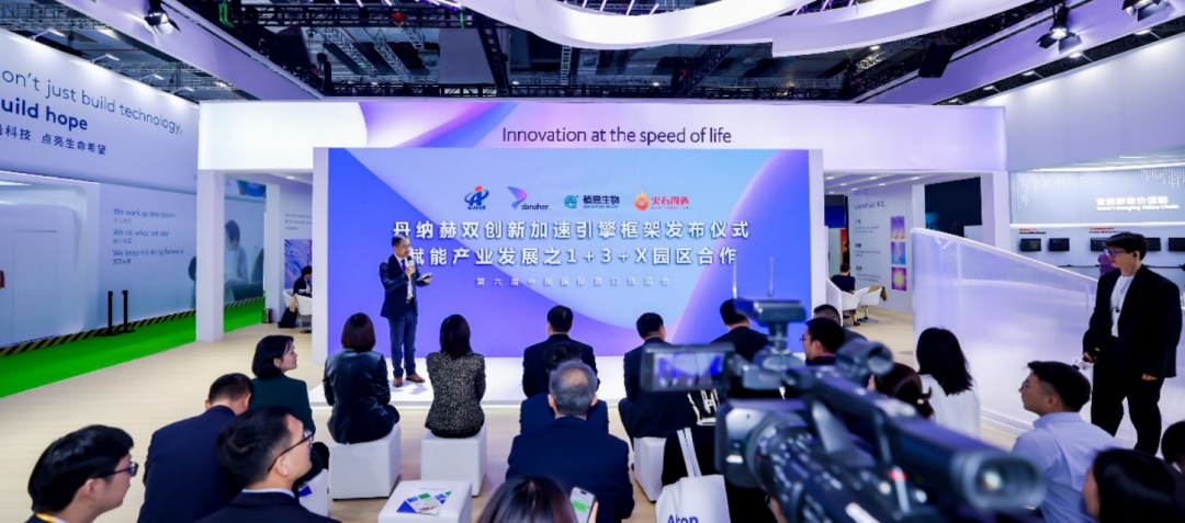 圖片▲第六屆進博會之際,丹納赫就“1+3+X”產業創新轉化加速器分別與商務部投資促進局、植恩生物、火石創造宣布合作