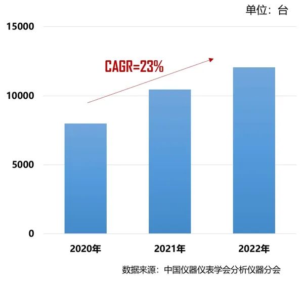 可見,即使處在2020-2022年疫情期間,加之中美貿易爭端和全球經濟不確定性疊加的情況下,我國對質譜儀器及服務的需求持續旺盛,市場空間不斷擴容,經計算,2020-2022年中國質譜儀器市場銷量及銷售額的年均復合增長率(CAGR)均超過20%,國內質譜儀器的增量空間和存量更新空間十分廣闊。