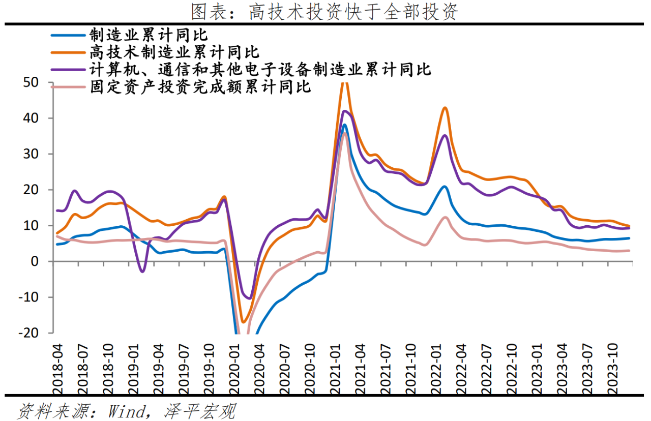 新興產業高速增長,裝備制造業、高技術制造業占規模以上工業增加值的33.6%和15.7%。汽車制造業增長13.0%,電氣機械和器材(包含光伏、新能源汽車電池等)制造業增長12.9%。其中,太陽能電池、汽車(新能源汽車)、集成電路、充電樁等產品產量增速分別為58.6%、9.3%(30.3%)、6.9%和36.9%。