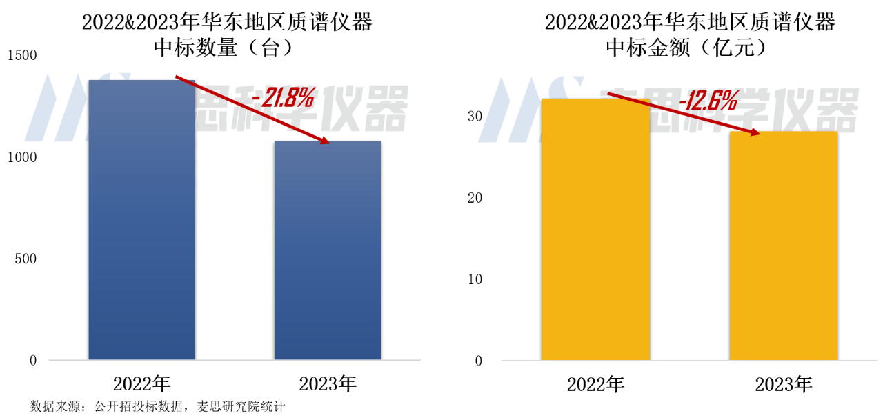 2023年華東地區(qū)質(zhì)譜儀器中標(biāo)數(shù)量約1100臺,同比減少21.8%。中標(biāo)金額約28億元,同比減少12.6%,降幅小于全國平均值。中標(biāo)數(shù)量和金額在全國市場的占比分別為36.5%和41.5%。