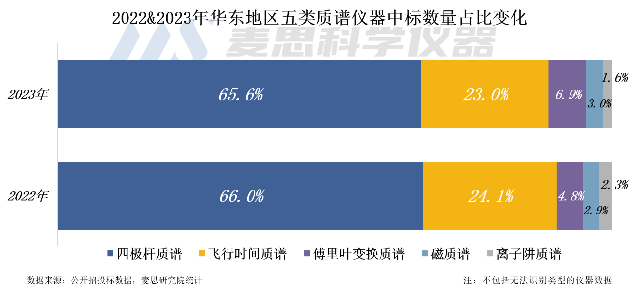 從各技術(shù)路線看,2023年華東地區(qū)四極桿質(zhì)譜中標(biāo)數(shù)量最多,占比65.6%,與2022年持平。飛行時間質(zhì)譜排名第二,中標(biāo)數(shù)量占比為23.0%,同比減少1.1個百分點。傅里葉變換質(zhì)譜的占比為6.9%,排名第三,同比增加2.1個百分點。