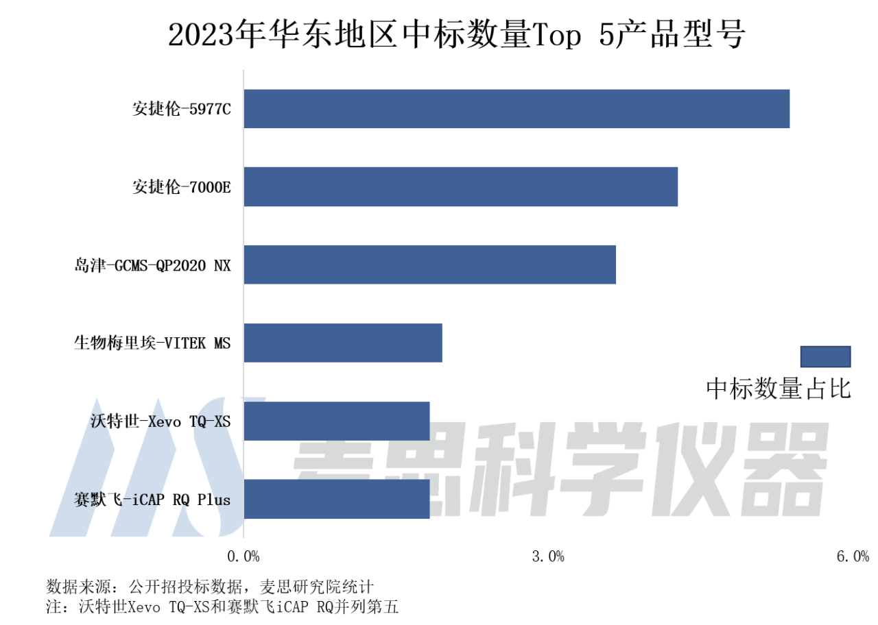 從產(chǎn)品型號來看,2023年華東地區(qū)質(zhì)譜儀器中標(biāo)數(shù)量Top 5產(chǎn)品分別為安捷倫-5977C、安捷倫-7000E、島津-GCMS-QP2020 NX、生物梅里埃-VITEK MS、沃特世-Xevo TQ-XS和賽默飛-iCAP RQ Plus(并列)。