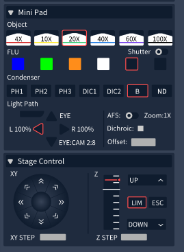 通過軟件控制顯微鏡的多種電動(dòng)部件,例如物鏡轉(zhuǎn)換、對焦、聚光鏡轉(zhuǎn)換、熒光模塊轉(zhuǎn)換等。