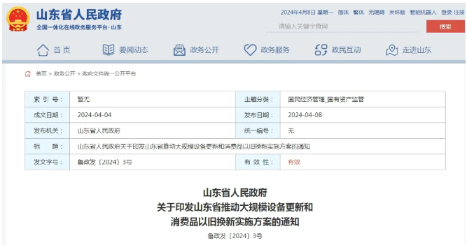 4月8日,《山東省人民政府關(guān)于印發(fā)山東省推動(dòng)大規(guī)模設(shè)備更新和消費(fèi)品以舊換新實(shí)施方案的通知》對(duì)外發(fā)布。