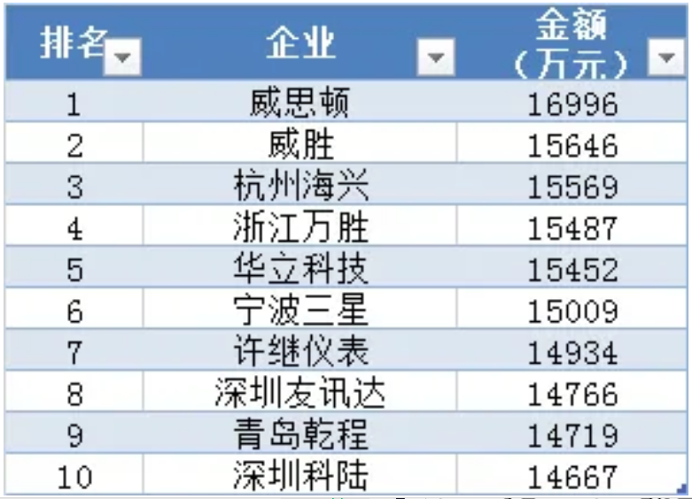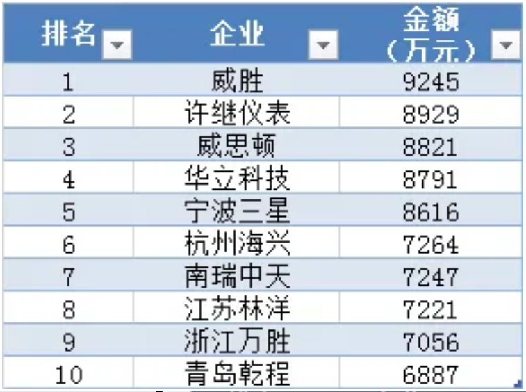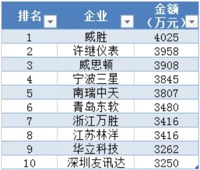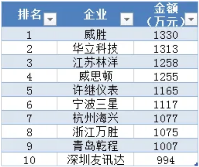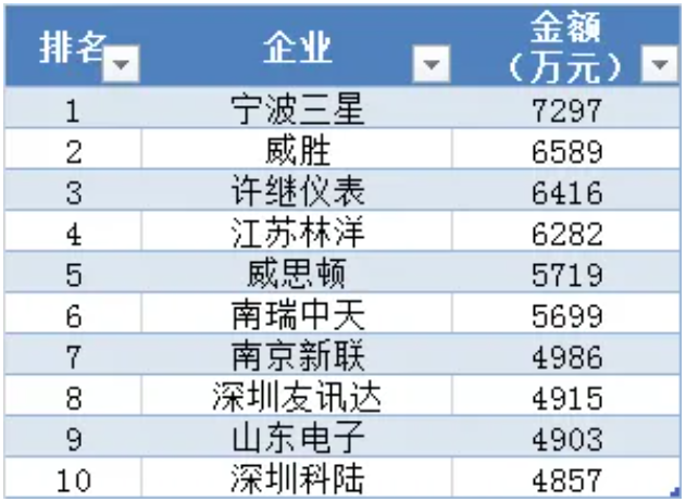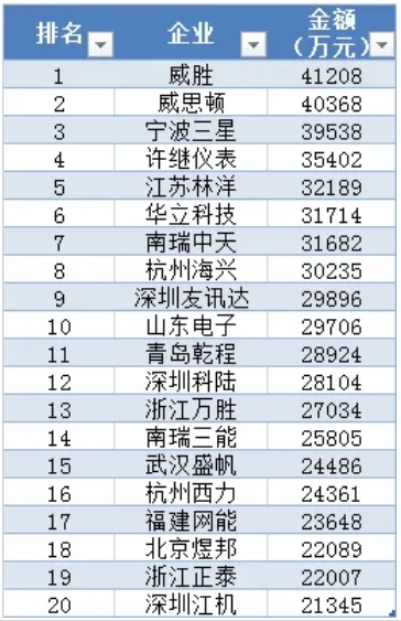 本批次總計有81家企業實現中標,中標金額前五名企業為威勝(威勝集團+威勝信息)、煙臺東方威思頓電氣有限公司、寧波三星醫療電氣股份有限公司、河南許繼儀表有限公司、江蘇林洋能源股份有限公司。