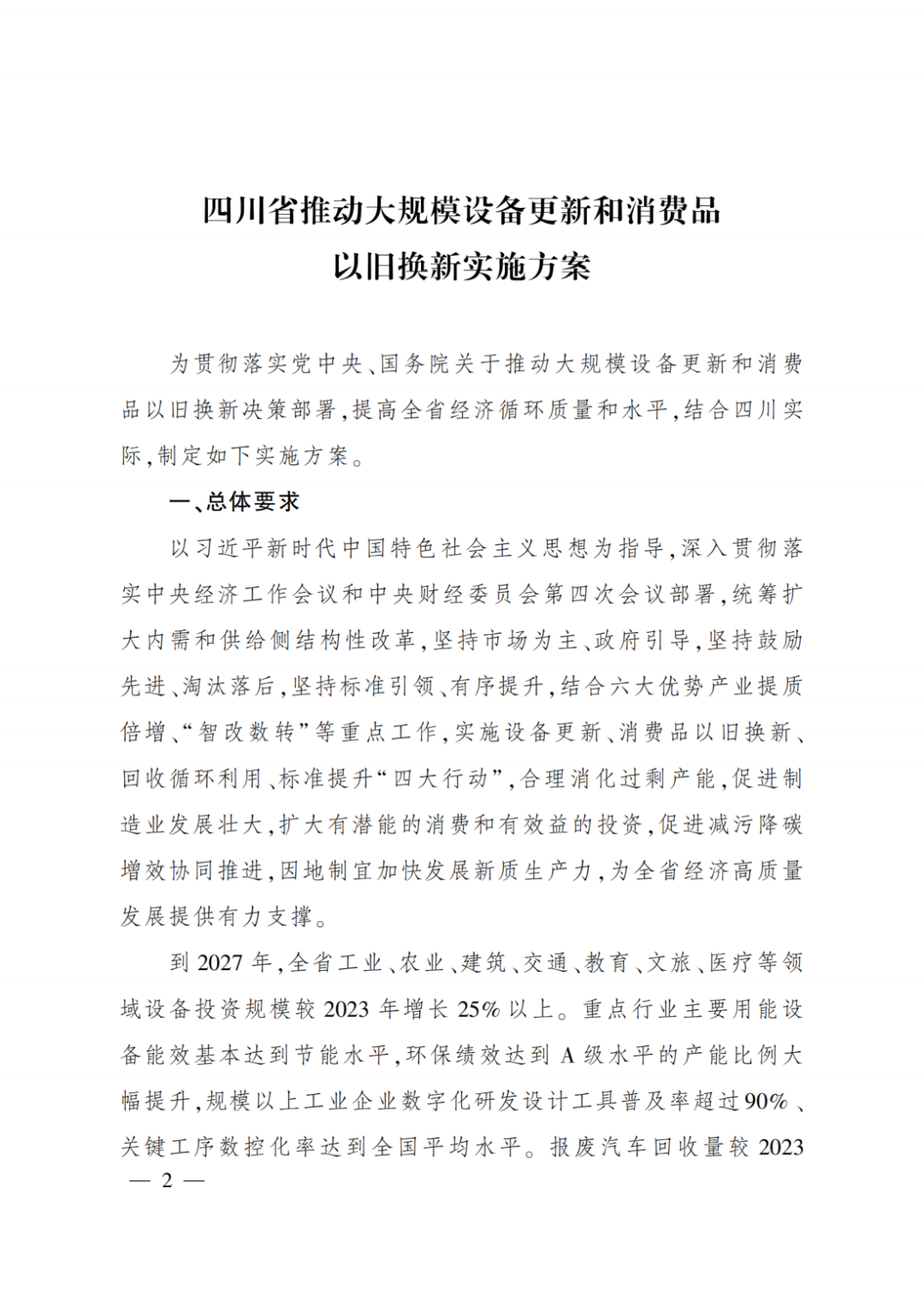 5月11日四川省人民政府網站發布關于印發《四川省推動大規模設備更新和消費品以舊換新實施方案》的通知。