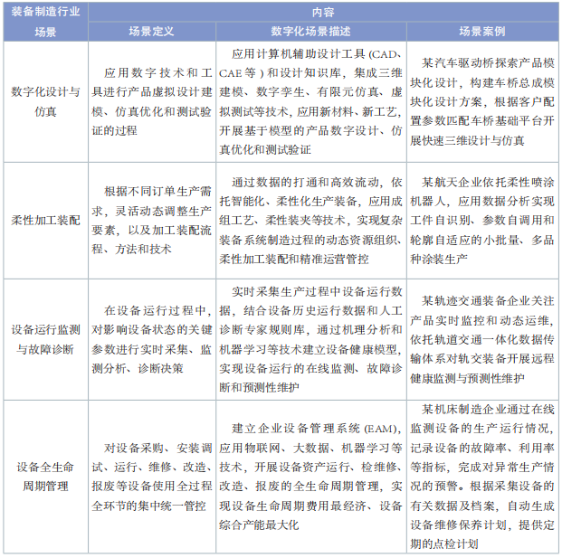 裝備制造包括通用裝備制造、專用裝備制造、汽車制造、鐵路、船舶、電氣機械、航空航天等行業門類,以離散制造為主。裝備制造行業數字化轉型要聚焦知識工程、AR/VR、數字孿生、可重構生產、人工智能等新技術和產品遠程運維、數據驅動服務、柔性敏捷生產等典型場景,打造高效柔性、敏捷響應、人機協同和動態調度能力,不斷優化裝備產品性能和服務水平?;诖?,整理出數字化設計與仿真、柔性加工裝配、設備運行監測與故障診斷、設備全生命周期管理 4 個典型場景,詳細場景內容見表 2。