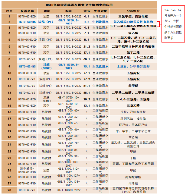 GB/T 5750.2023生活飲用水衛生標準、GBZ/T 300-2017工作場所空氣有毒物質測定、GB/T 18883-2022 室內空氣中TVOC測定等職業衛生常見的標準,涉及的前處理儀器有很多種,包括頂空進樣器、熱解吸儀、吹掃捕集、固相微萃取,但檢測端均為氣相色譜,因此實驗室需要經常更換前處理設備,以完成不同的檢測任務。