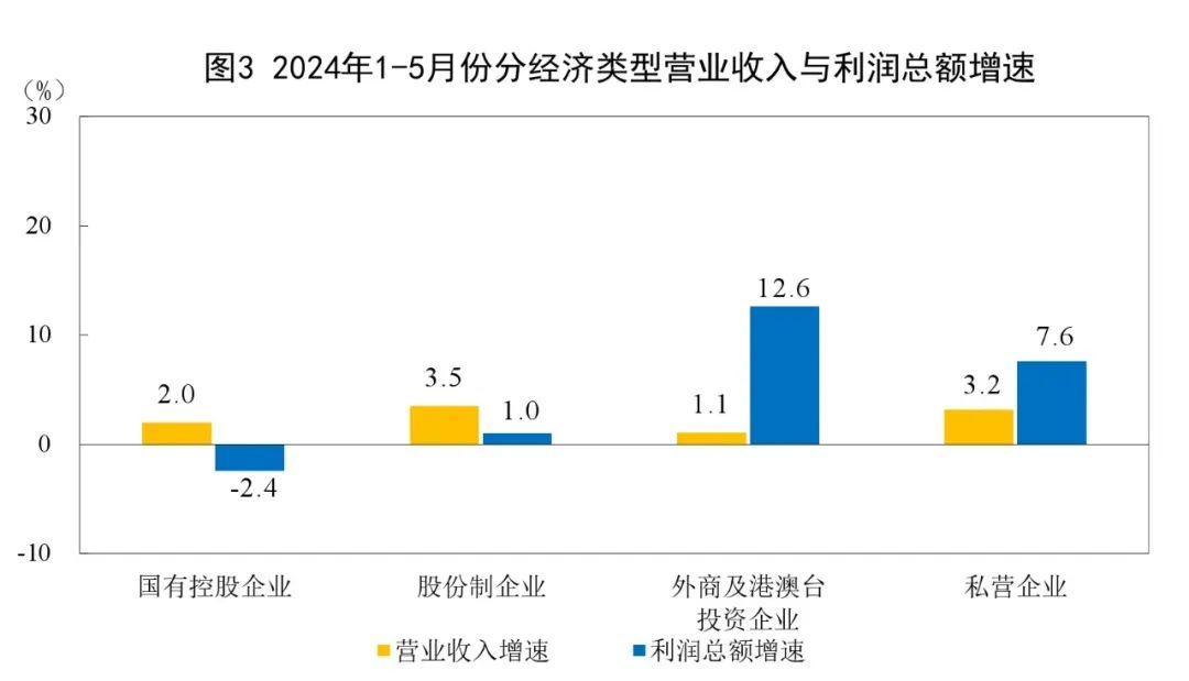 1—5月份,規(guī)模以上工業(yè)企業(yè)中,國有控股企業(yè)實(shí)現(xiàn)利潤總額9438.4億元,同比下降2.4%;股份制企業(yè)實(shí)現(xiàn)利潤總額20510.5億元,增長(zhǎng)1.0%;外商及港澳臺(tái)投資企業(yè)實(shí)現(xiàn)利潤總額6827.8億元,增長(zhǎng)12.6%;私營企業(yè)實(shí)現(xiàn)利潤總額7329.3億元,增長(zhǎng)7.6%。