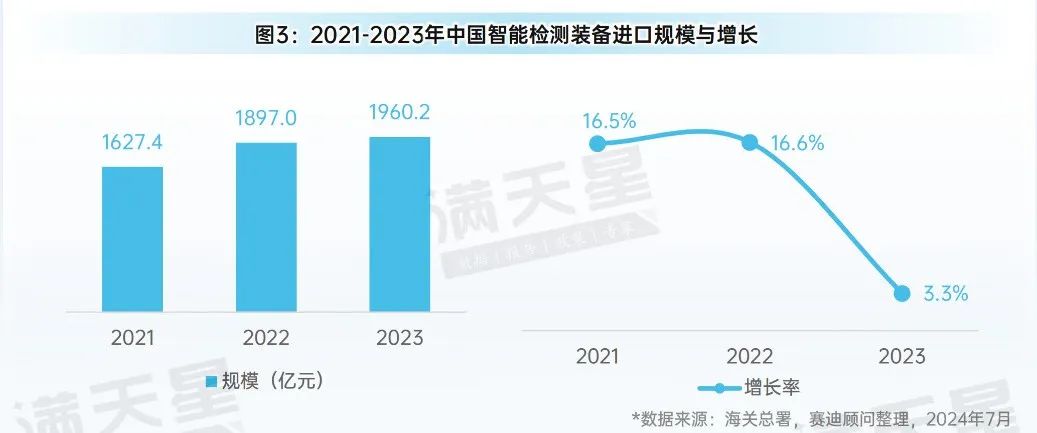 圖3:2021-2023年中國智能檢測裝備進口規(guī)模與增長